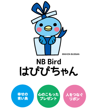 幸せの青い鳥・心のこもったプレゼント・人をつなぐリボンをコンセプトにデザインをおこし、当社オリジナルのキャラクター(NB Bird)+親しみやすい名前(はぴぴちゃん)を意識して「NB Birdはぴぴちゃん」と名付けました。
