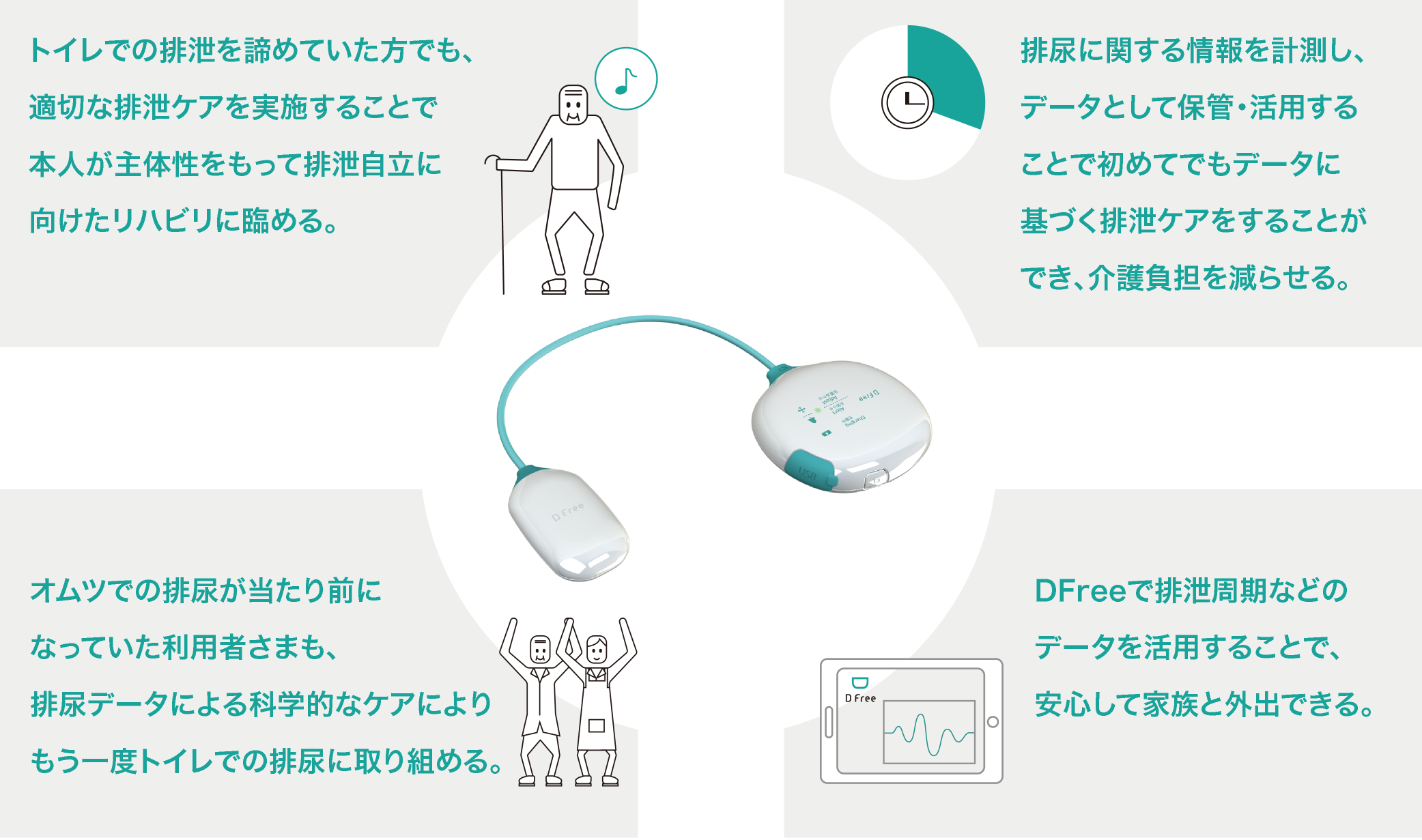 DFree は、超音波センサーを用いて膀胱の変化を捉えることができるIoT ウェアラブルデバイスです。