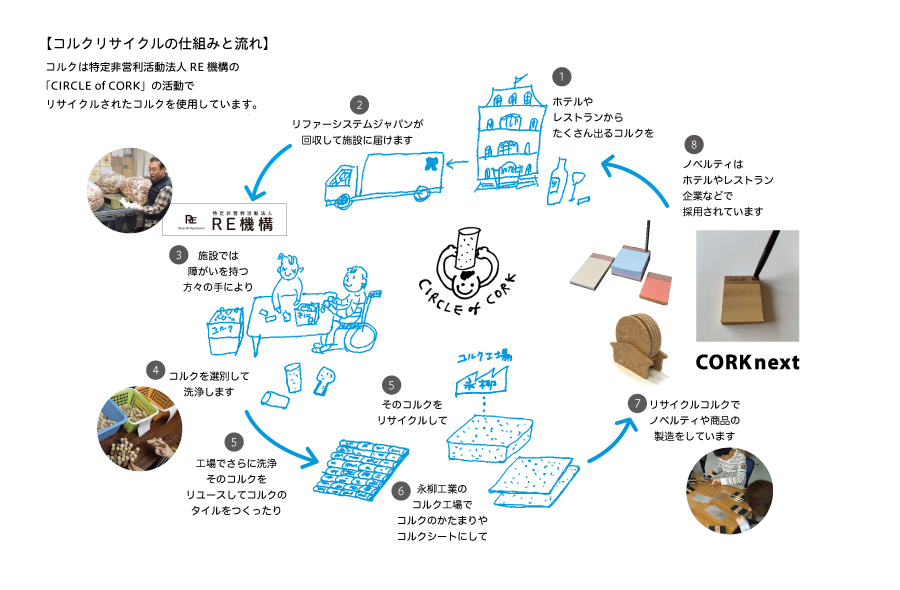 このリサイクルコルクは特定非営利団体RE機構の”CIRCLE of CORK”という活動でリサイクルされたもので、リサイクル過程の一部は障がいのある方々の仕事として、自立支援の一助となっています。